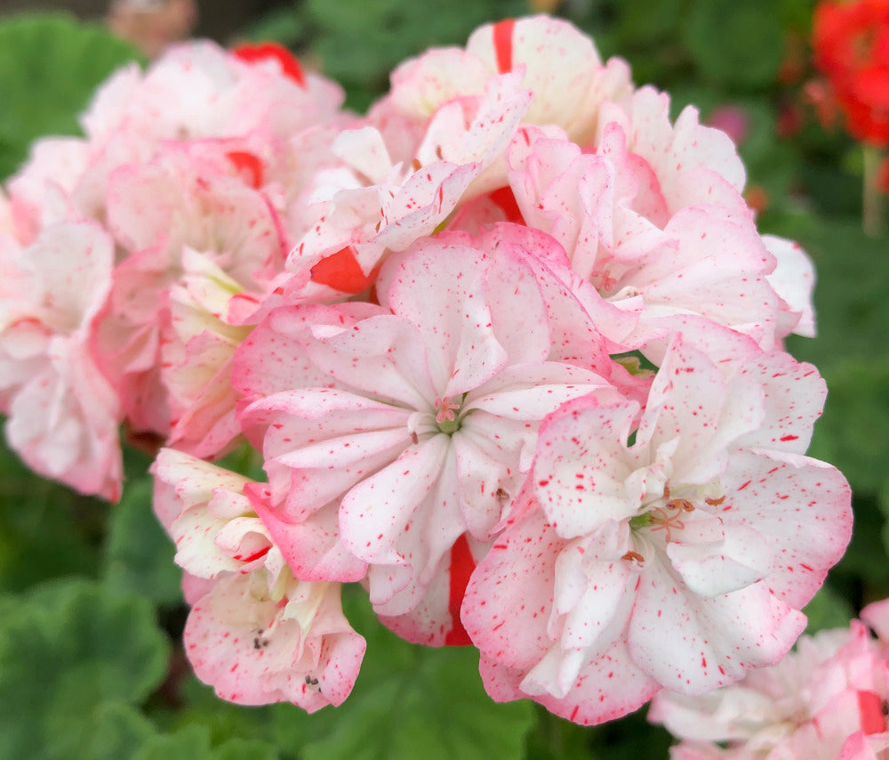 A lovely new Double Zonal with white flushed flowers speckled & striped in red. A neat grower & very free flowering. One of our new varieties for 2021 raised by Mr Guest from Stourport-on-Seven.