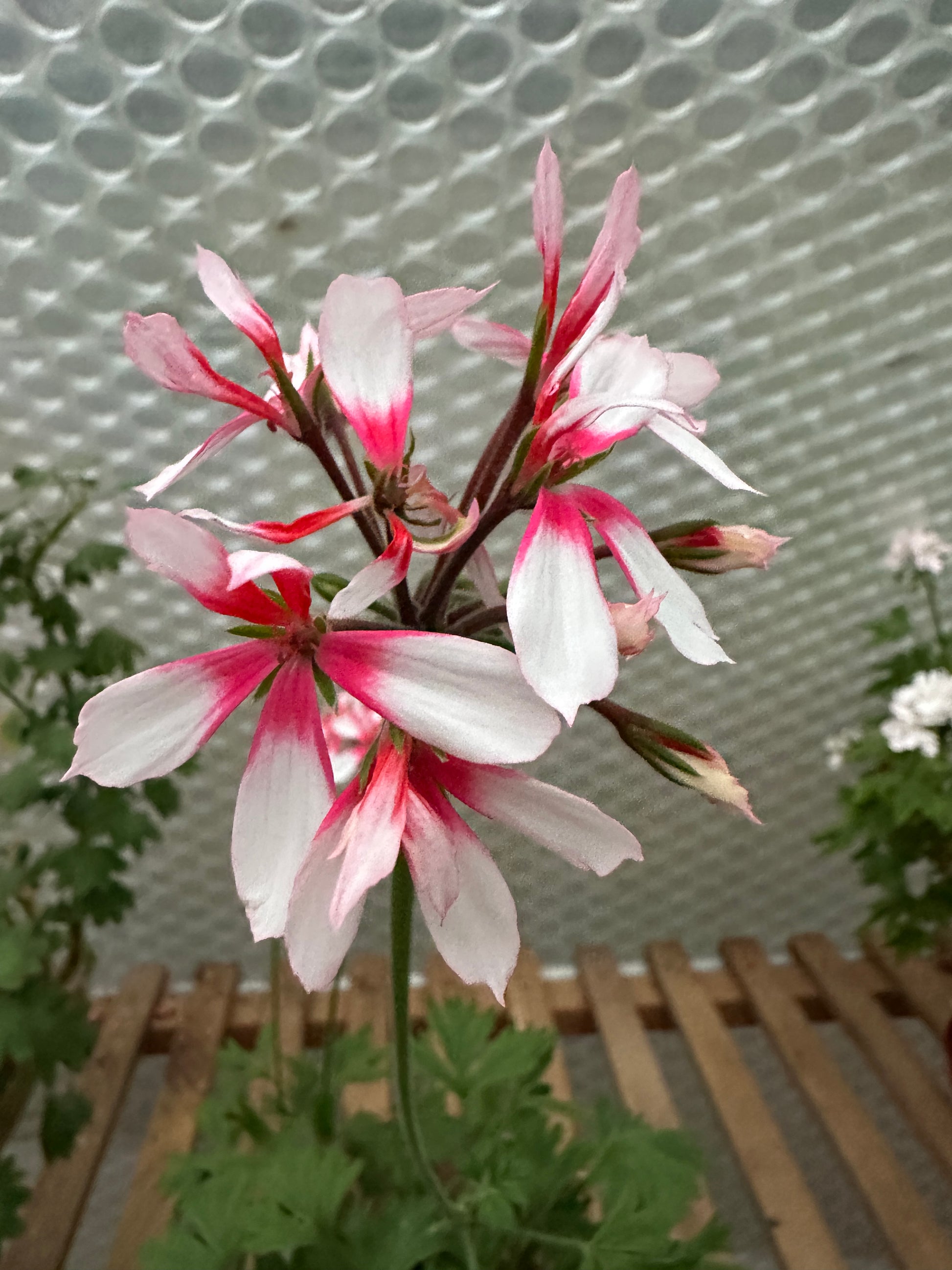 Rushmoor Coast Redwood, a single Formosum Pelargonium raised by Steve Pollard. Single white flowers with a large deep pink centre, sets it apart. A large plant with dark green leaves.