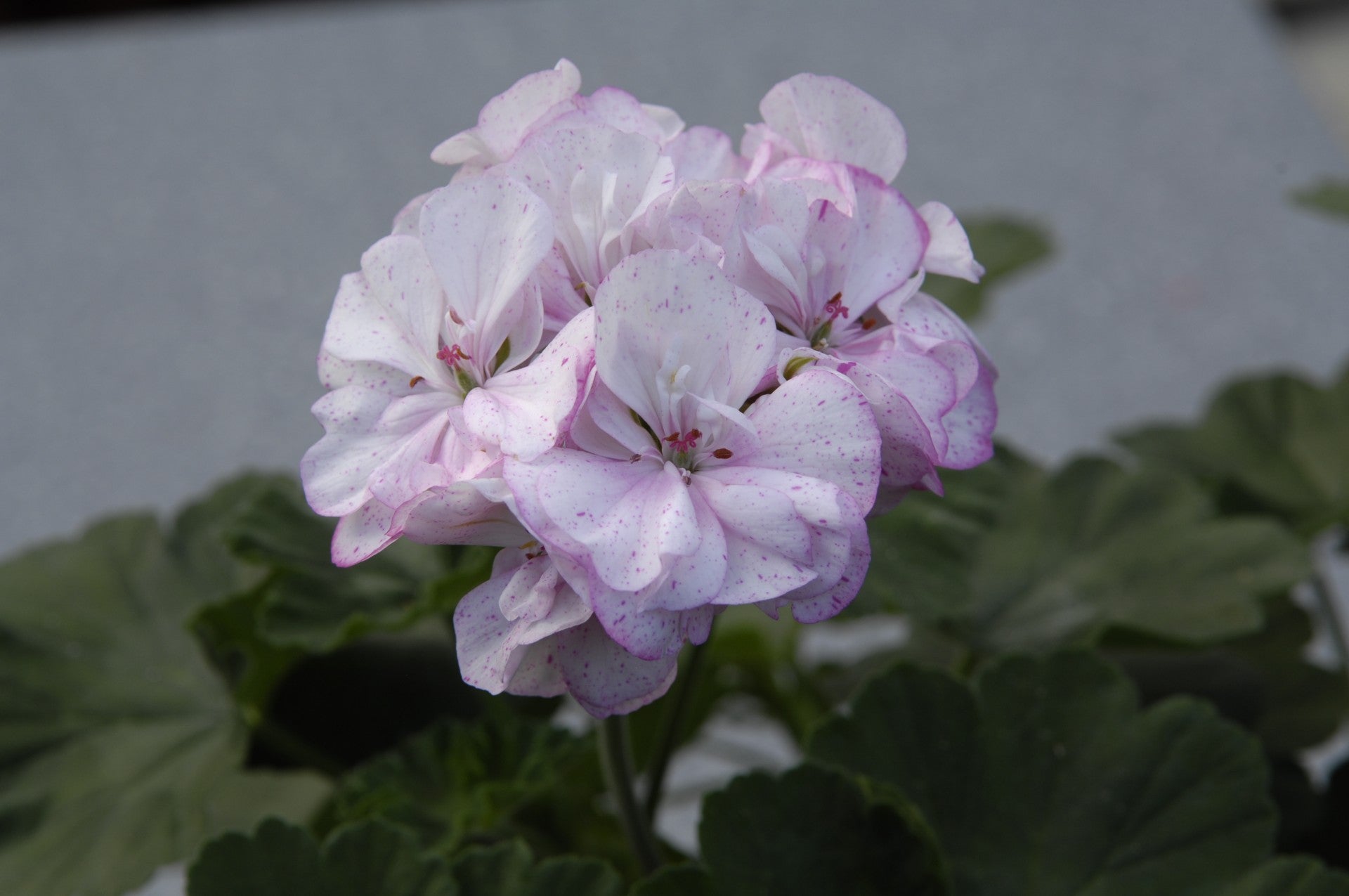 Rushmoor Spotted Shrimp, a stunning plant, with double white flowers with purple spots and splashes. This zonal is a strong grower and a prize winner when exhibited as a large standard at the National show.